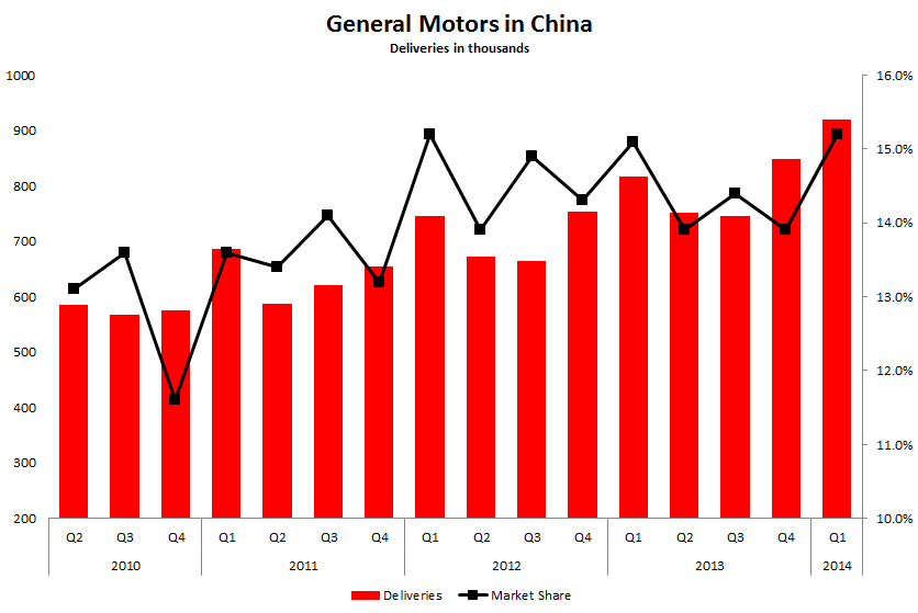 General Motors plans to drop a massive $12 billion wad of cash into its Chinese operations, between 2014 and 2017, in its effort to juice manufacturing capacity by 65% by the end of this decade. So far, GM's strategic push in the region has been successful; here's a look at how GM has increased its vehicle deliveries as well as market share recently: