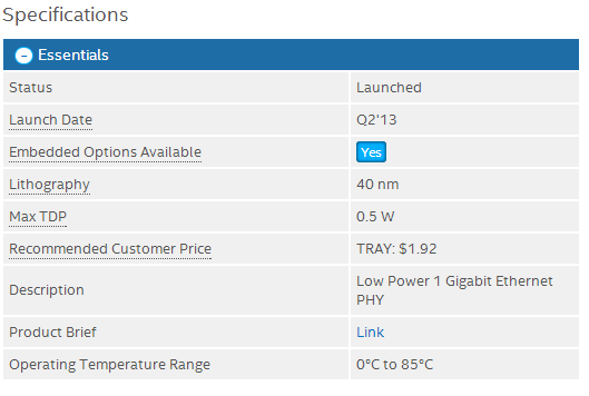 If you go to Intel's ARK page -- which is a database of all current and past products -- you can look up some of these products. For example, if you do a search for the Clarksville LAN chip, you'll see the following: