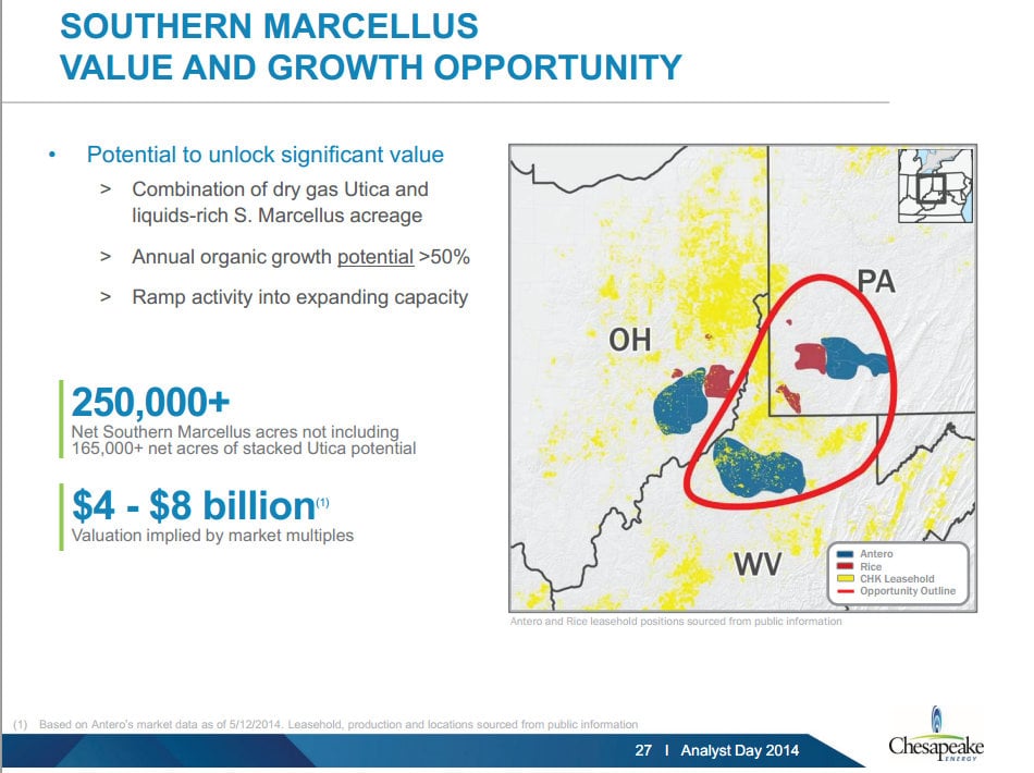 Chesapeake Energy held more than 250,000 net acres in the southern Marcellus Shale, which is detailed on the map in the below slide.