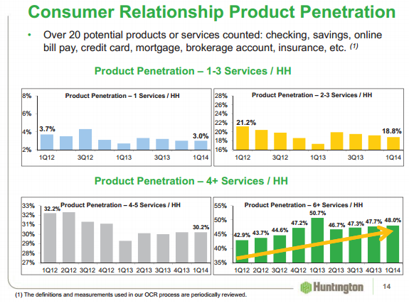 And Bank of America isn't the only one, as Huntington Bancshares speaks to its "Optimal Customer Relationship Model," or OCR, as it seeks to not simply to gain customers, but also to develop more expansive relationships with them. Huntington says the end result of its "Welcome" culture, combined with execution and management from its sales force, results in this OCR, which in turn leads to "higher customer profitability."
