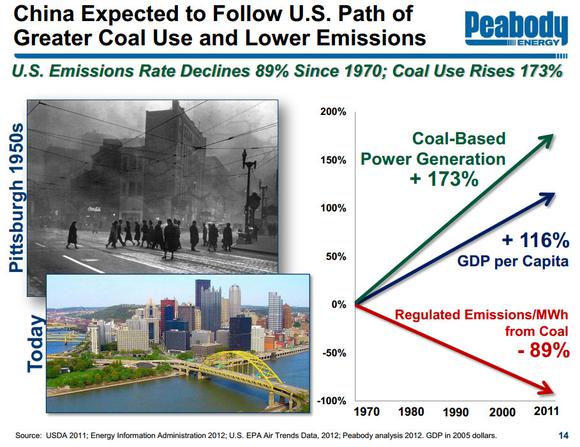 The reason Pittsburgh has transitioned from the filth of coal dust in the 1950s to one of the world's cleanest cities is found on the graph on the right hand side of that same slide. That chart notes that coal-based power generation in America is up 173% since 1970. But at the same time, regulated emissions per megawatt hour from coal have plunged 89%. Clearly, coal isn't as dirty as it once was as America has really cleaned up its emissions profile.