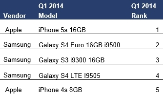 ABI Research just released data this week showing the 16GB iPhone 5s was the most popular smartphone in calendar Q1 2014. The rankings include the top 20 smartphones, with the 5s taking the top spot and the 8GB iPhone 4S taking No. 5. Not surprisingly, Samsung's Galaxy lineup filled in the gap between the two.