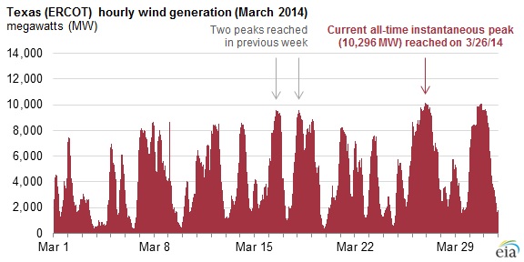 Just this March, Texas set an all-time peak wind generation high of 10,296 megawatts (MW).