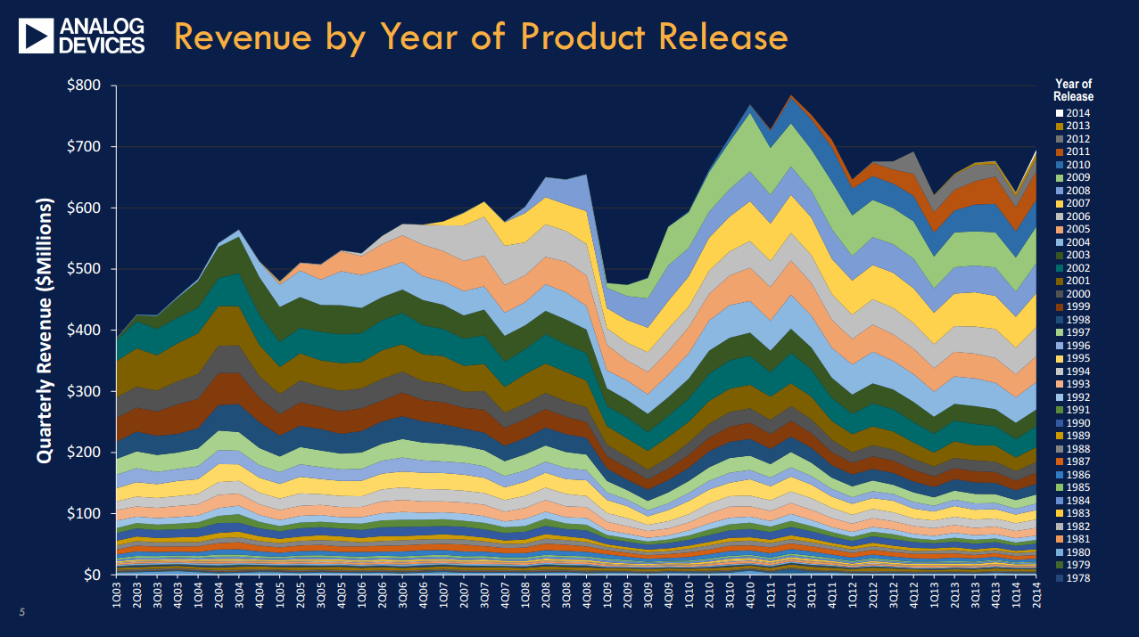 Management is also predicting continued growth throughout the rest of the year for its business segments. Thanks to focusing on the higher end of the market, Analog Devices' business products have stable prices and long lifecycles. Because of this, the company claims that each generation of new products basically provides an annuity that can go on for decades, something that can be seen in the following graph.