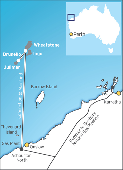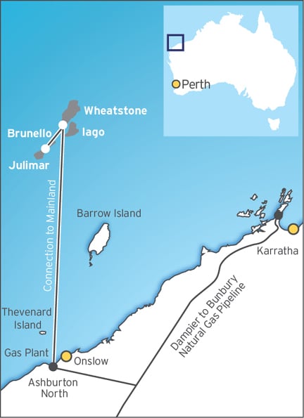Construction started on the project in December 2011. The facilities will include an onshore gas plant and a liquefaction plant with two processing trains providing a capacity of about 8.9 million tons per annum, or MTPA, of LNG. Natural gas from Chevron's Wheatstone and Iago fields will provide 80% of the gas for the plants, with the other 20% supplied from the Julimar and Brunello fields held by Apache and Kuwait Foreign Petroleum Exploration. Chevron has buying commitments for about 85% of its share of LNG from the project.