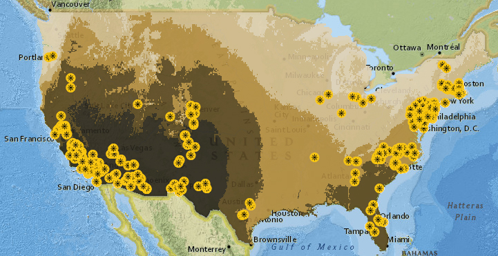 RGS Energy operates in most of the same states as SolarCity; however, RGS Energy has a presence in some states in which SolarCity doesn't, like Missouri, New Hampshire, Rhode Island, and Vermont. Although New England may not seem like the most logical region in which to develop solar resources, in actuality, the Northeast has been quite popular. In the map below, the darker shades of brown represent the areas with the greatest solar power production potential, while the yellow circles represent currently installed solar power plants.