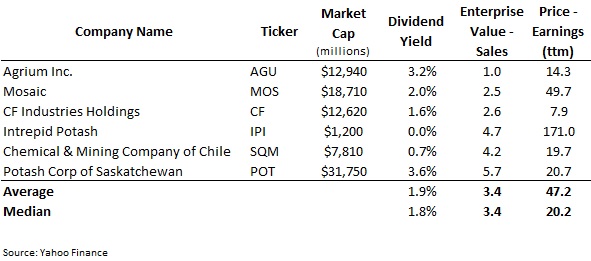 Among six companies in the peer group, Agrium has the lowest enterprise value-to-sales multiple of 1.0 versus the group median of 3.4 and the second lowest price-to-earnings multiple at 14.3 versus a median of 20.2 trailing earnings.
