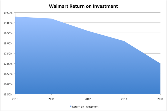 But Wal-Mart's long-term trends don't look particularly rosy. In an article here I highlighted how international operating income is dropping like a rock, while here I noted that operating margin and return on investment are plummeting, as you can see below.