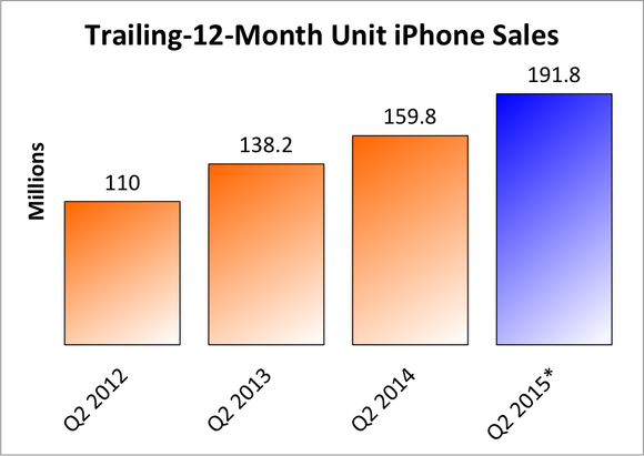 Nowhere is this more clear than in the following chart, which shows the growth of annual iPhone sales for the trailing twelve months ending in Apple's second fiscal quarter.