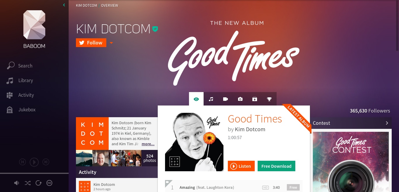 Dotcom's music service, Baboom, isn't your typical Spotify replacement. The service is focused on providing listeners with an optimal listening experience. That means lossless audio files and certainly no ads between songs. It also means letting users download songs to listen wherever and however they want. (Dotcom is even providing music stems from his own album to let listeners remix his work.)