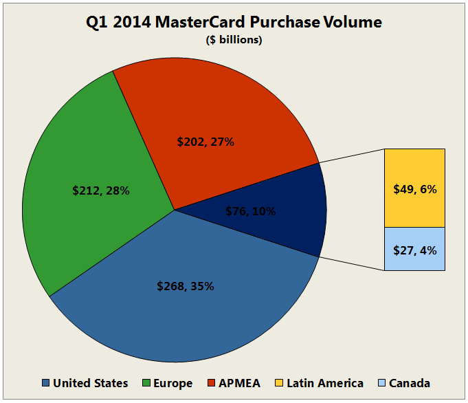 The opportunity that exists across the globe is truly astounding. Outside of the United States, MasterCard saw its purchase volume grow by 15% on a local currency basis from the first quarter of 2013 to the first quarter of 2014. And 65% of its purchases come from foreign countries:
