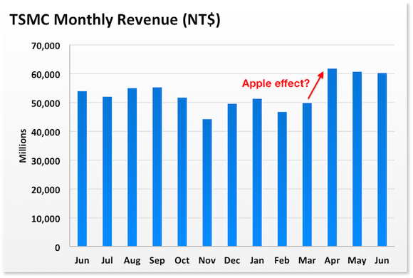 Apple is expected to comprise about 10% of TSMC's revenue this year. The reported timing also lines up well with a boost in TSMC's monthly revenues. TSMC enjoyed a notable bump in sales in the second quarter.