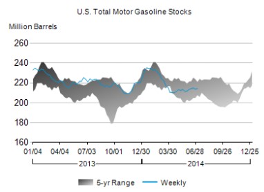 Distillates supplies, which include diesel and heating oil, edged up 0.2 million barrels (0.2%) for the sixth-straight week of expansions. Distillates demand for the last four weeks is down a seasonally adjusted 6.2%. In the past year, distillates inventories have inched up 0.2%.