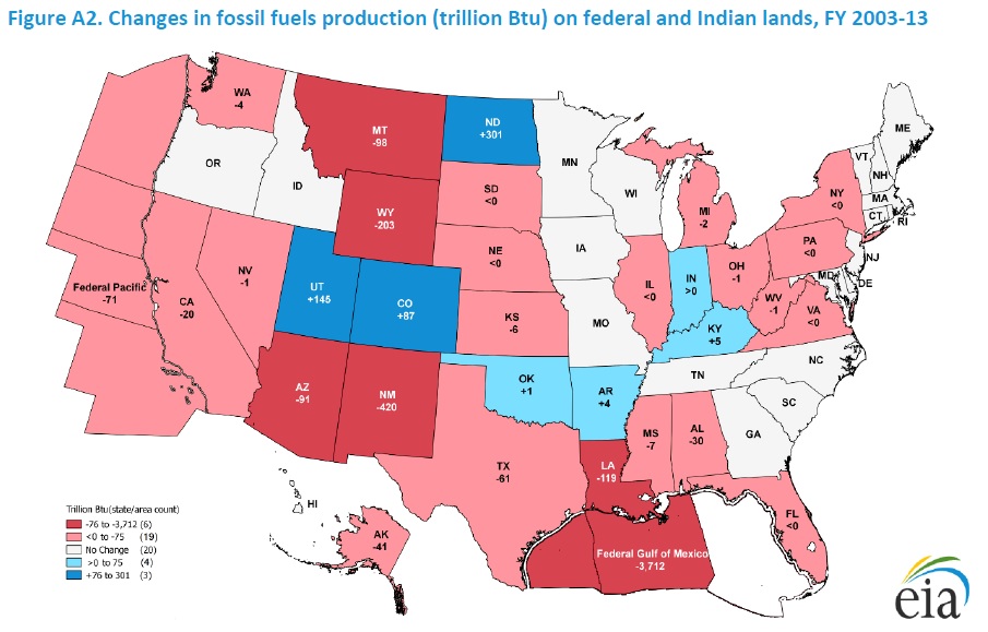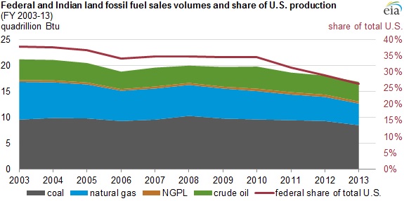 A new report from the U.S. Energy Information Administration shows that the production of fossil fuels from federal lands fell in 2013 (the latest reporting period). This is a continuation of a long-term decline evident since at least 2003 (the earliest reporting period).