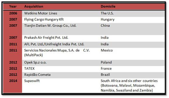 In its 2013 10-K, FedEx says that "as the world's economy has become more fully integrated, companies are sourcing and selling globally." Delivery companies are a direct beneficiary of the global buying and selling since they facilitate this trade. FedEx is present in more than 220 countries and handles 90% of the global GDP. It has significantly increased the pace of its international acquisitions in the last three to four years, with nine out of the last 10 acquisitions outside the U.S.