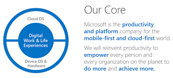 At our core, Microsoft is the productivity and platform company for the mobile-first and cloud-first world. We will reinvent productivity to empower every person and every organization on the planet to do more and achieve more.