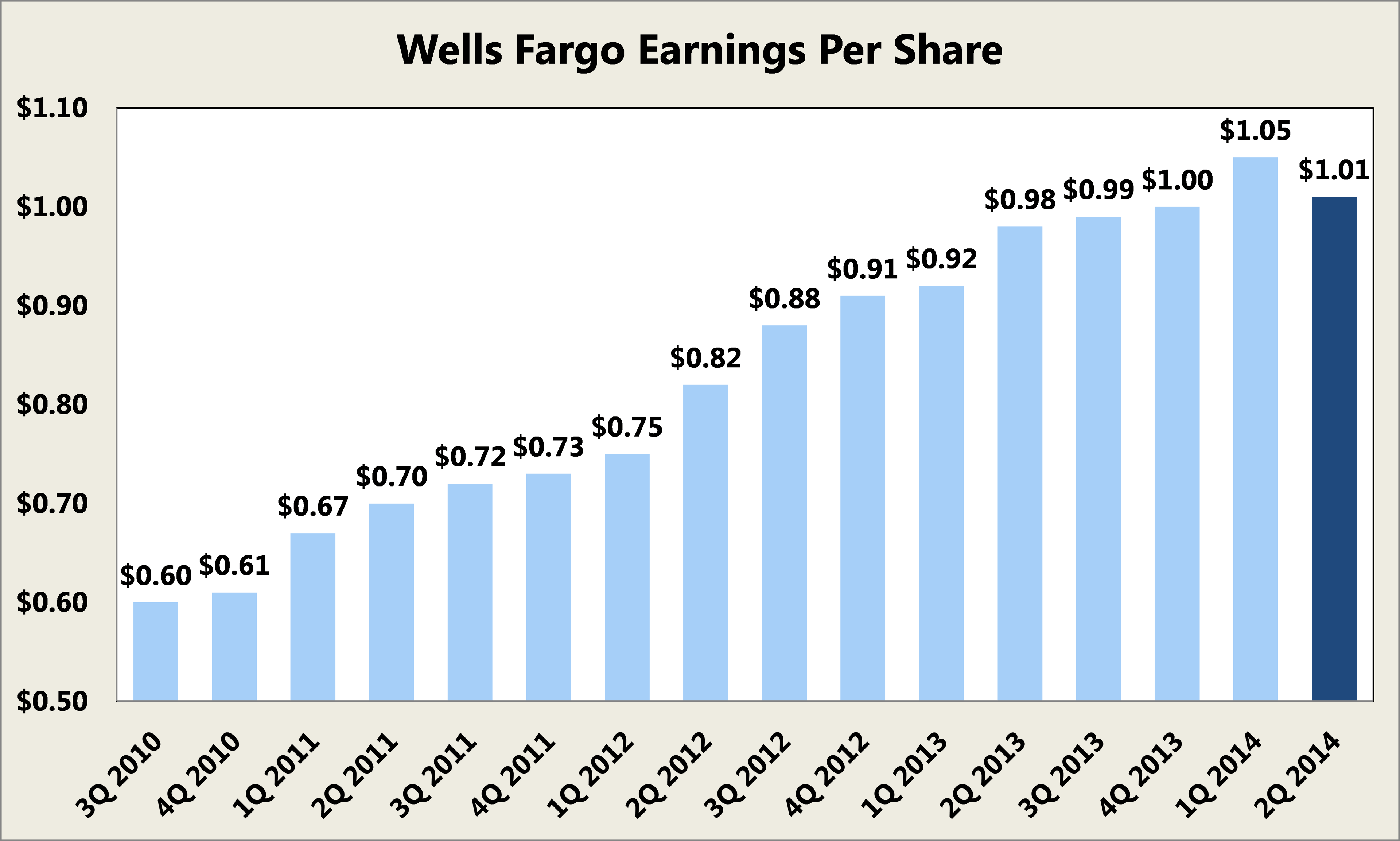 Today Wells Fargo (WFC 0.86%) announced its earnings for the second quarter of 2014, and while it reported strong growth, its streak of 15 consecutive quarterly earnings records came to an end as its earnings per share stood at $1.01, a gain of 3% over the second quarter of 2013, but down relative to the first quarter of this year.