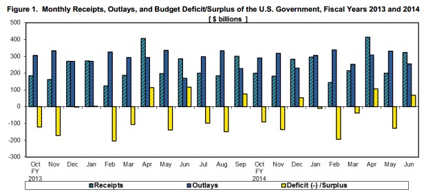 Overall June receipts (inflow) added up to $324 billion, while outlays totaled up to just $253 billion. Individual and corporate income taxes contributed just over $210 billion toward June's receipts.