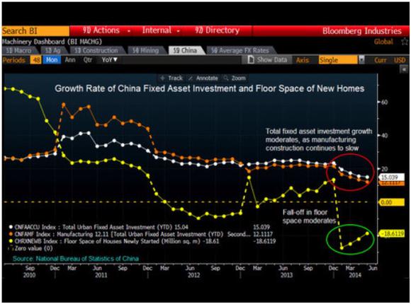 According to a recent Bloomberg report, China's fixed asset investment year to date gains fell to 15% in May from 22% in April, marking the fourth consecutive month of slowed growth. Most of the weakness has been felt in manufacturing construction. The report also shows that the floor space of newly started homes fell by 18.6% in May compared to a 1% increase last year. This is taking a toll on the demand for construction equipment. Difficulty in obtaining financing and inventories of new and used equipment are making the situation even more difficult.