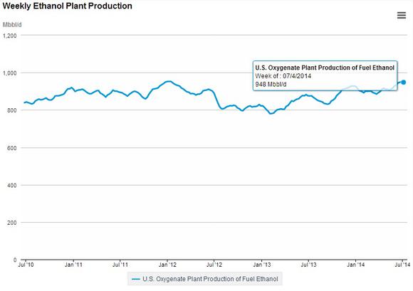 The U.S. Energy Information Administration (EIA) reports that U.S production of ethanol (the predominate biofuel in use) is the highest it has been since Jan. 2012.