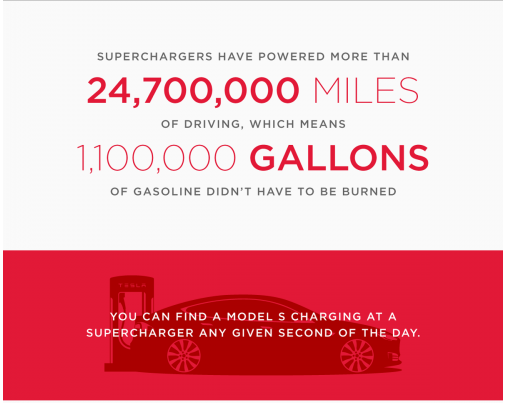 In June, Tesla's Supercharger network passed a charging milestone, delivering more than 1 GWh of energy to Model S vehicles in a single month. That energy accounts for a collective 3.7 million miles driven, 168,000 gallons of gas saved, and 4.2 million pounds of carbon dioxide offset. That's like driving to the moon and back seven and a half times, and nixing a day's worth of CO2 from 73,684 Americans.