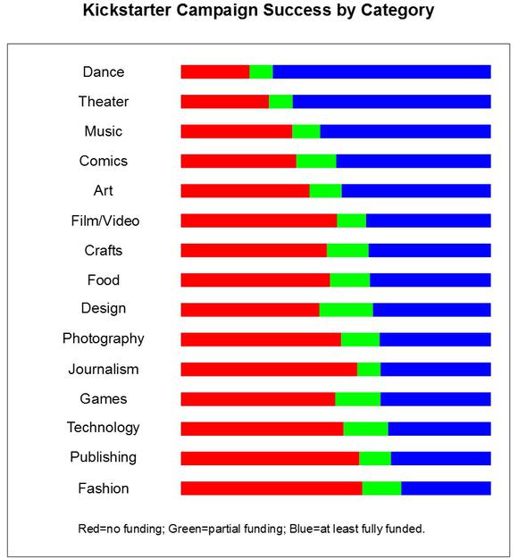 While Kickstarter has raised more than $1 billion in funding for a variety of entrepreneurial and arts-related projects, there are many projects that gain little to no traction. Using Kickstarter's own numbers, we evaluated project success by category. Dance, theater, and music have had the most success, perhaps because these are types of projects that are most likely to come to the site with a group or have an established community. Food -- potato salad's category -- is somewhere in the middle.