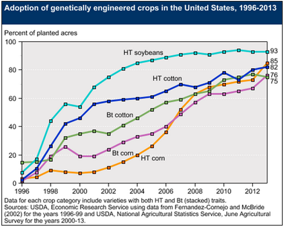 The spread of genetically enhanced agricultural crops in the United States has been nothing short of amazing. Since arriving on the commercial scene in 1996, soybeans, cotton, and corn engineered to withstand herbicides, insecticides, or both had captured as much as 93% of their respective market as of 2013. That has meant big business for trait companies such as Monsanto (MON +0.00%), Dow Chemical (DOW +0.00%), and Syngenta (NYSE: SYT).