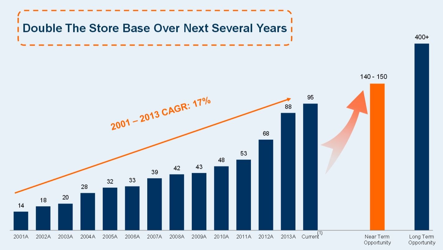 Besides, the company still has abundant room for growth. Tile Shop ended the first quarter with a relatively small base of 95 stores in 30 states, and the company is planning to open roughly 13 new stores during the remainder of 2014, ending the year with approximately 108 stores. On a longer-term basis, the company believes it has enough room for more than 400 stores in the U.S., so it is barely getting started when it comes to growth potential.