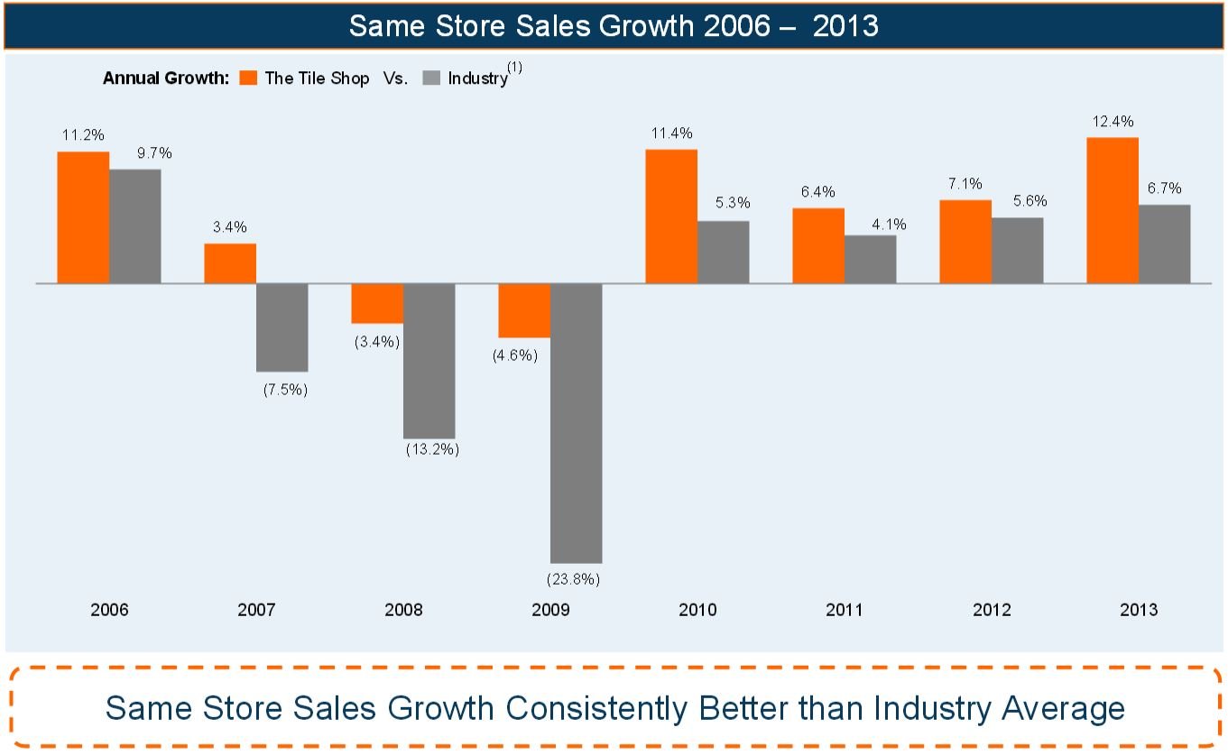 Tile Shop has built a solid competitive position due to its deep specialization in ceramic and stone tile, a broad selection of products in that category, and a specialized customer service. According to management, Tile Shop has consistently outperformed the industry over the last several years because of these strengths.