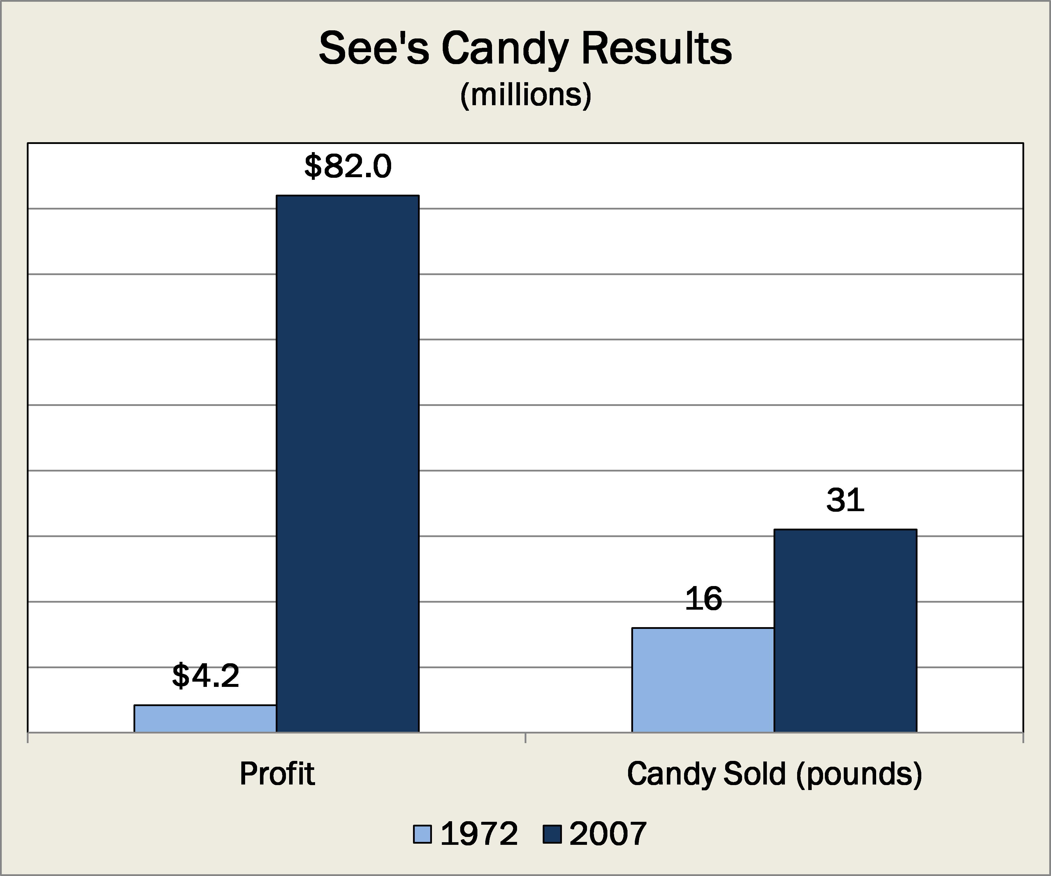 In 1972, See's sold 16 million pounds of candy, and 35 years later, it stood at 32 million, meaning it gained just 2% a year, but it's profit rose by 9% a year: