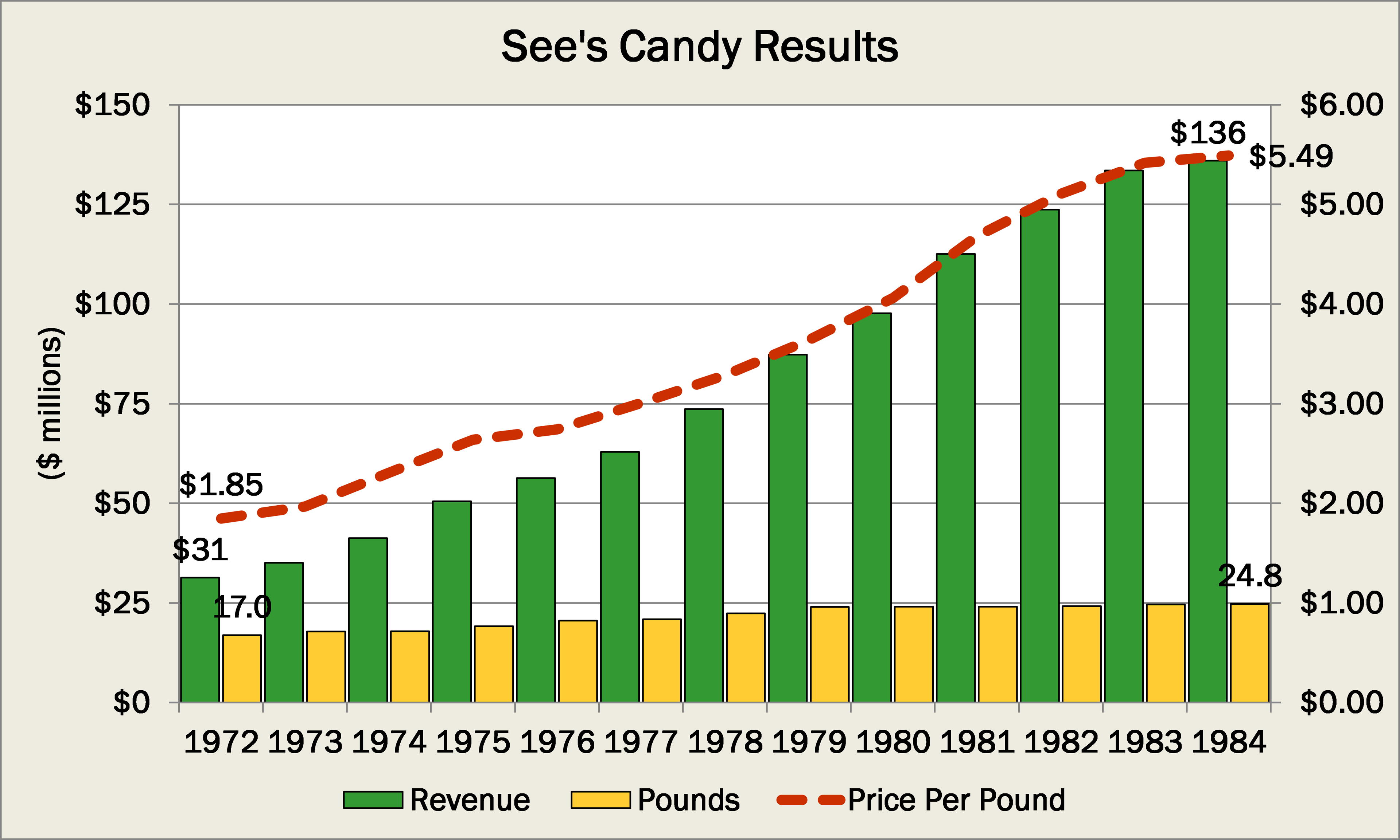 In 1972, it sold 17 million pounds of candy, and by 1984, that number had grown to 25 million pounds, a gain of roughly 50%. Yet it went from having $31 million in revenue to $136 million, an increase of 333%. How did it do it? Little by little, it raised its price per pound: