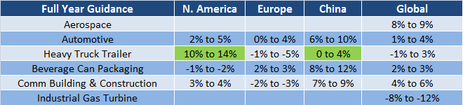 A summation of Alcoa's end market guidance reveals that the only formal upgrade to its outlook was in the heavy truck and trailer market. The parts in green are where upgrades took place.