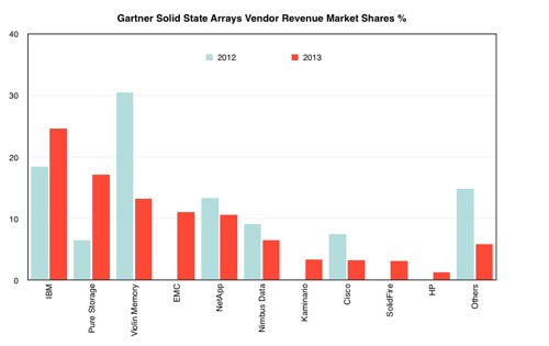 According to the Gartner report, the SSA market grew 182.1% in 2013 to reach $667.3 million. IBM now owns 24.6% of this market, after dislodging Violin Memory (NYSE: VMEM) from the No. 1 spot.