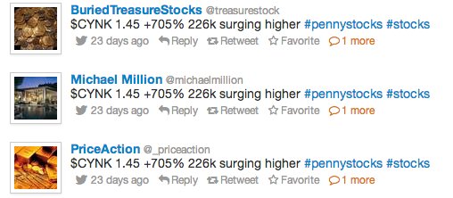 Cynk Technology likely rode this two-headed beast from a penny stock all the way to $5 billion. Cromwell Coulson, president and CEO of OTC Markets Group, recently stated in Bloomberg Businessweek that Cynk's meteoric rise was likely due to a flood of blog coverage and positive Twitter posts. Indeed, footprints like these remain all over Twitter: