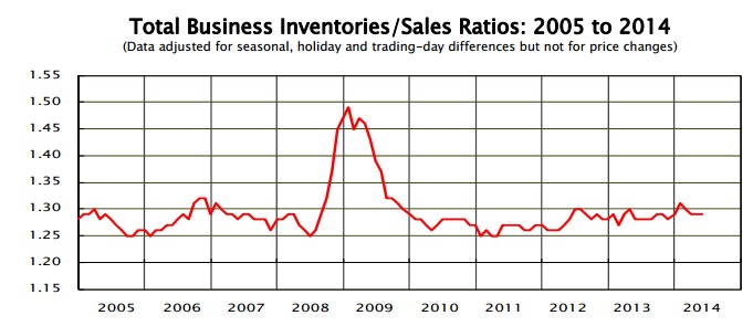 To understand the rate at which goods are being made and sold, economists compute an inventories/sales ratio. Since sales and inventories both expanded at relatively similar rates, the inventories/sales ratio remained steady at 1.29. In May 2013, the ratio stood at a slightly smaller 1.28.