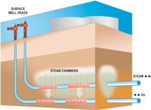 Stream assisted gravity drainage, or SAGD, is a form of oil extraction used in Canada's oil sands. The way SAGD works is through two different wells that run side by side, working together toward a common goal. On top is the well that injects steam into the ground, which heats up the cold bitumen (a form of oil) and allows it to flow down into the production well underneath the steam well.