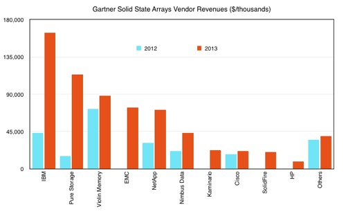 EMC (EMC +0.00%) is one of the traditional storage companies that have embraced the tidal wave of the rapidly morphing storage industry. Gartner's numerical navel-gazers have delved into solid state arrays and found that EMC sprung to fourth position in SSA revenue in a standing start. The company recorded a revenue of $75 million from SSA revenue in 2013, up from virtually zero in 2012, overtaking rival NetApp (NTAP +1.27%) in the process.