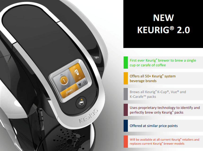 The real importance of Keurig 2.0, however, comes in the proprietary technology that will be embedded in new brewers. This technology will allow Keurig 2.0 brewers to identify and brew only Keurig packs.