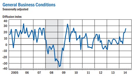 For July, the survey's general business conditions index clocked in at 25.6 points, up significantly from June's already impressive 19.3 reading. Analysts had actually been expecting a downturn, and were pleasantly surprised when their 17.8-point estimate proved far too pessimistic.