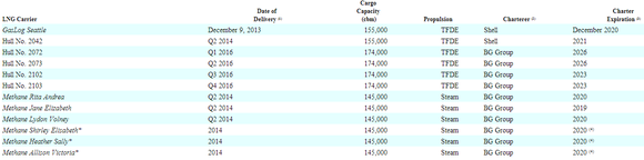 As I mentioned earlier, the partnership's initial fleet is all contracted with the BG Group, a major international oil and gas company. Out of the 12 dropdown candidates, all six steam vessels are contracted with BG till 2020. Two of the TFDE are contracted with Shell through 2020, and the remaining four TFDE vessels (which will be delivered in 2016) are also contracted with BG Group past 2022.