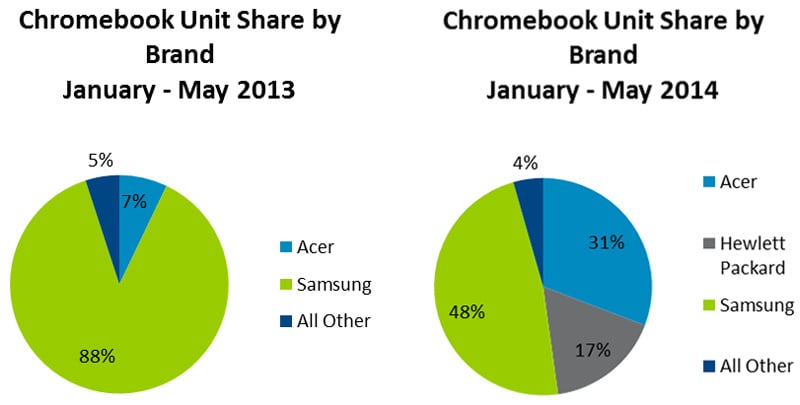 Breaking down the Chromebook gains, Samsung remained the sub-market leader with a 48% share. But that's down from 88% in the year-ago period. Samsung's Chromebook shipments nearly doubled year-over-year while sales for Acer and HP jumped from infinitesimal to significant: