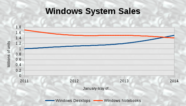Don't write Microsoft off quite yet, though. Windows is seeing a renaissance in corporate desktop systems. Windows desktops outsold Windows-based notebooks in the January-May period, capping a long-term trend of rising desktop sales and slowly waning Windows laptop orders. The trend lines finally crossed: