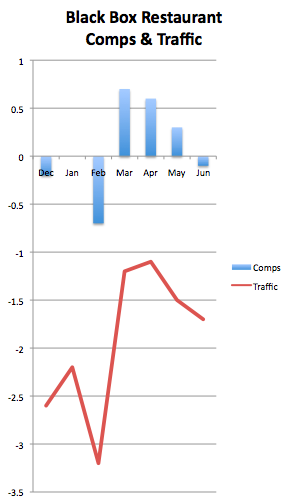 The latest numbers from the Black Box Intelligence and People Report show that same-store sales at restaurants open at least a year turned negative in June, while traffic at those stores continued its downward drop. The industry hasn't posted a single quarter of same-store traffic growth since the recession. Further, with second-quarter 2014 comps barely inching 0.3% higher, it calls into question whether the recovery Wall Street was expecting in the back half of the year will actually materialize.
