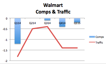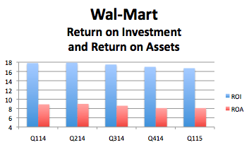 Its fiscal 2015 first-quarter earnings recorded their fifth straight quarterly decline in U.S. sales as store traffic fell for the sixth consecutive quarter. Wal-Mart's return on investment, which it views as a meaningful metric for investors scoring its ability to deploy assets, dropped below 17%, while its return on assets fell to almost 8%.