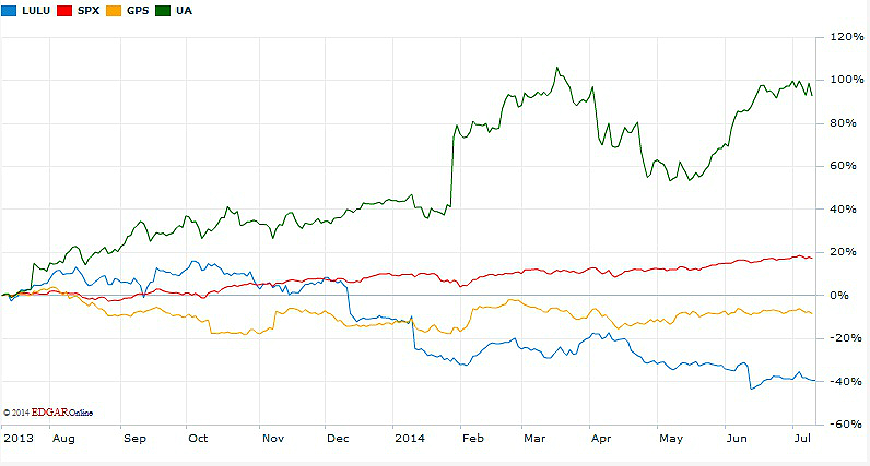 Overall, Lululemon has been the major disappointment among the three companies during the past twelve months, as shown below.