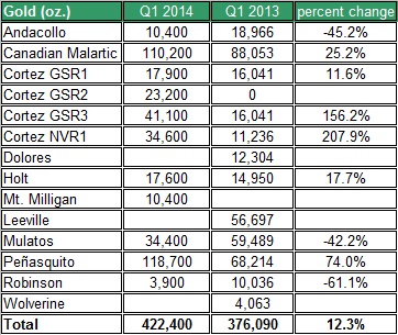 The other side of the equation will be the realized price of gold. In the past quarter, the average market price of gold reached $1,285 per ounce; this is only 0.5% below the average price during the first quarter of 2014 and 9.2% below the price of gold in the same quarter last year.