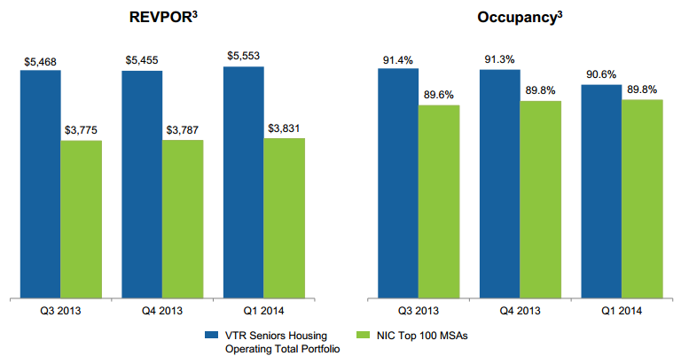 With all that in mind, you may be asking yourself, what do the areas in which it finds itself have to do with its bottom line results? As shown in the chart below, the revenue per occupied room, or REVPOR, Ventas is head and shoulders above the national average: