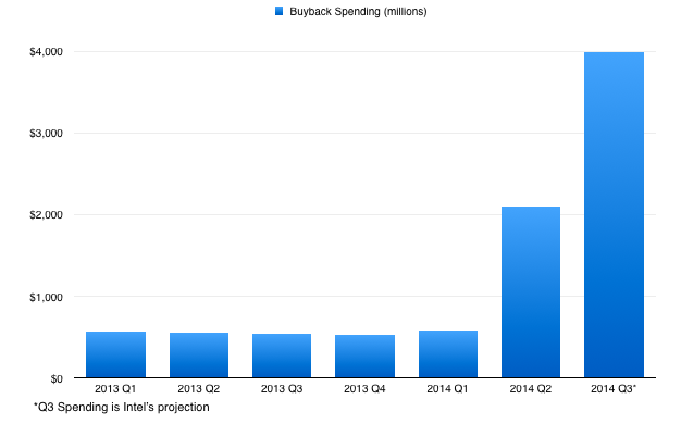 Intel's quarterly spending on stock buybacks. Source: company financial filings.