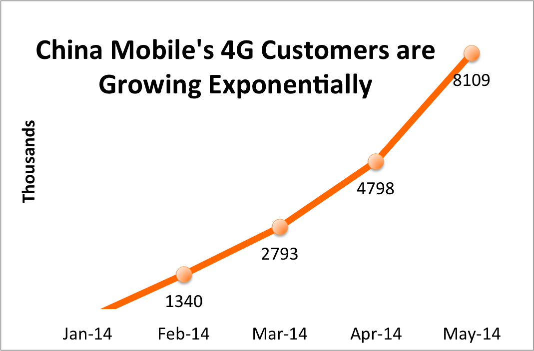 The growth in 4G subscribers at China Mobile appears to be exponential. Obviously Apple's data intensive and premium-priced iPhones will be a key beneficiary of China Mobile's expanding LTE network.