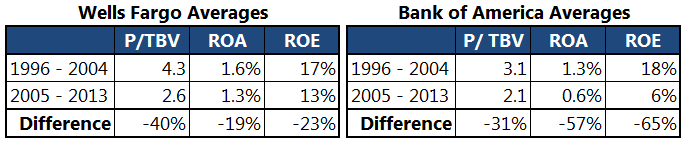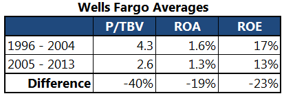 Sure, Wells Fargo's trading multiple has fallen in the nine years since Buffett began aggressively adding to his position. And although its profitability -- as measured by its return on assets, or ROA, and return on equity, or ROE -- has fallen as a result of the financial crisis, the gap isn't nearly as dramatic as the drop seen in its relative valuation.